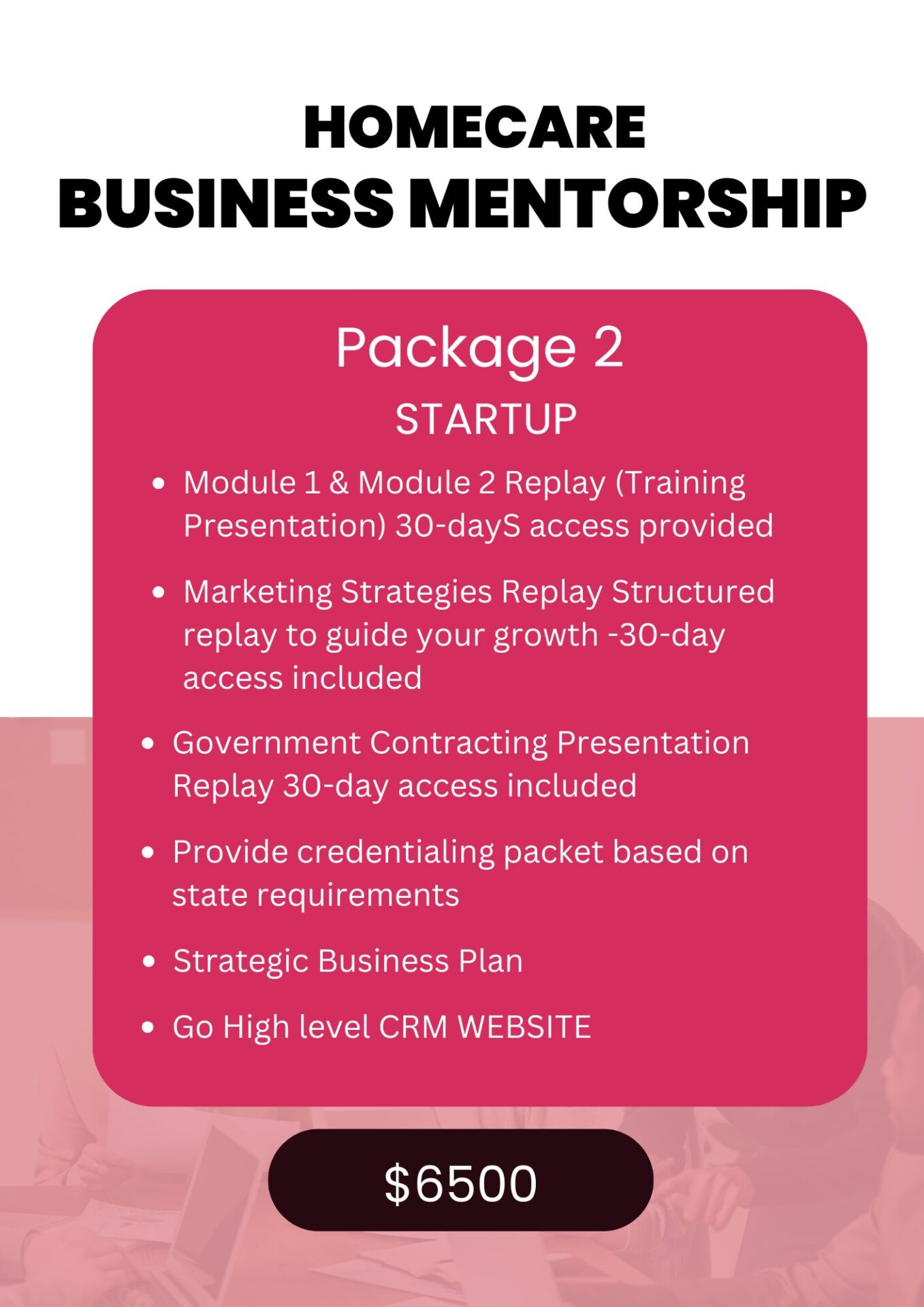 Get personalized one-on-one mentorship to kickstart your home care business. Our comprehensive package includes expert assistance with policies and procedures, state and federal setup, and strategic business planning. From structuring your business to navigating federal regulations, we provide tailored guidance to help you succeed. Our services cover everything from business plan development and grant writing to policy and procedure creation and marketing strategies. Let us help you lay the foundation for a successful home care venture.